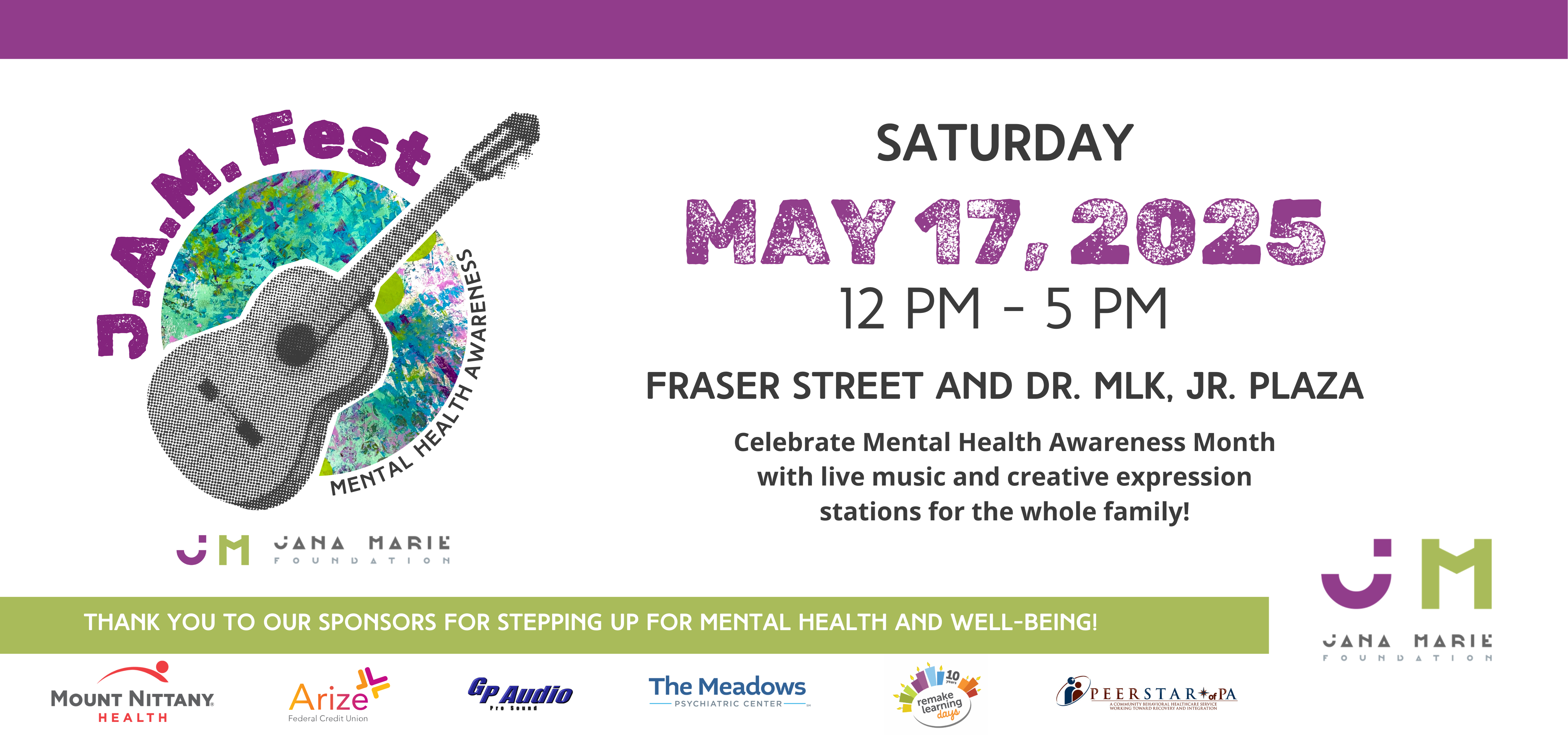 J.A.M. Fest is a community-wide mental wellness day designed to help increase well-being, build connections, and foster self-expression. Held annually in downtown State College, the event features live music, yoga, meditation, stations for creative expression, artwork to view, and more.