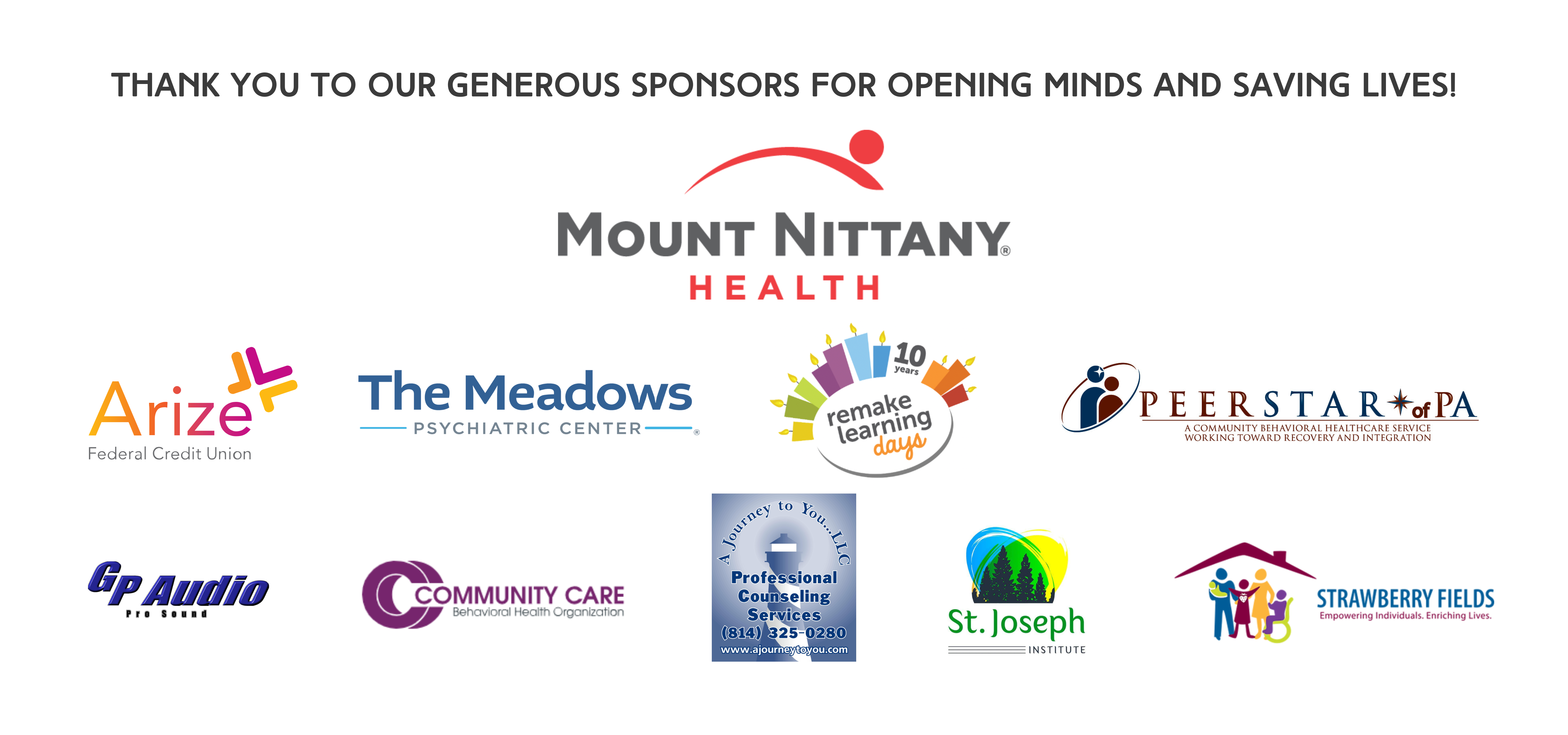 Thank you to this year’s key sponsors, Mount Nittany Health and GP Audio, for keeping this event accessible and fun! Thank you to all of our generous sponsors for helping to open minds and save lives! Learn more about them below.