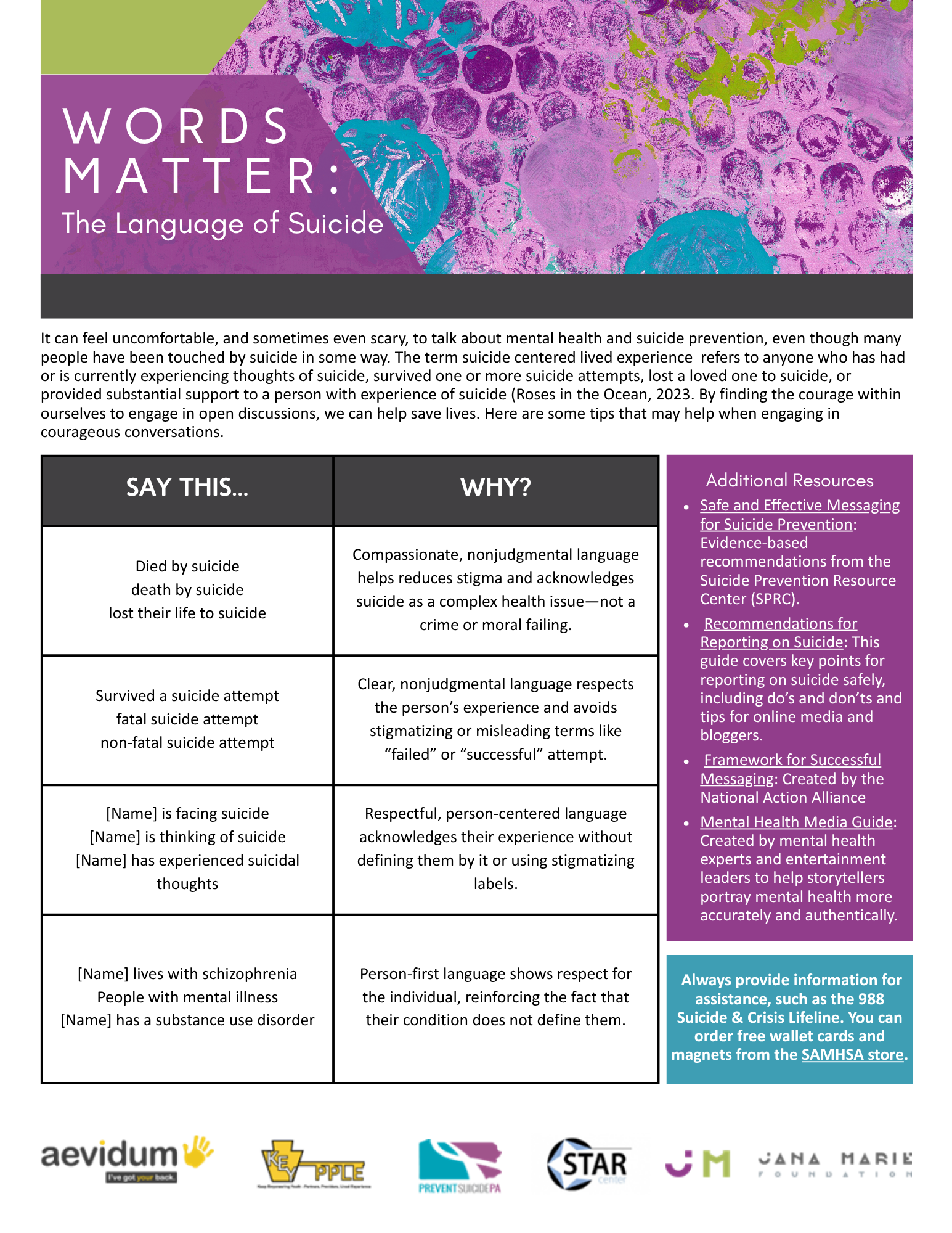 Thank you for your interest in downloading additional resources to support suicide prevention awareness. Below, you’ll find tools and materials designed to help you spread hope, raise awareness, and encourage meaningful conversations within your community. Click on the images below and then you can save.
